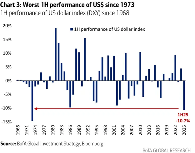 The USD has had the roughest first-half since 1973. While a weaker USD is positive for S&P 500 earnings it also signals that markets are becoming increasingly concerned about US fiscal and monetary policy.