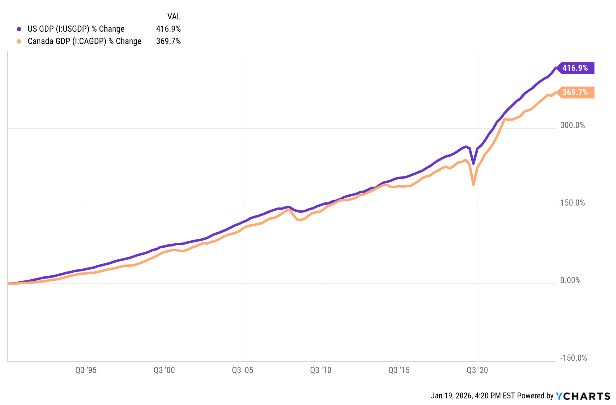 2. US GDP: Quarterly Seasonally Adjusted Annual Rate (USD), as of December 23, 2025. Canada GDP: Quarterly Seasonally Adjusted Annual Rate (CAD), as of November 28, 2025.