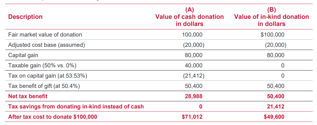 In this example, the donor has securities worth $100,000 that have an adjusted cost base of $20,000. The donor is in the top tax bracket in Ontario, with a marginal tax rate of 53.53% and a donation tax credit rate of 50.4%.