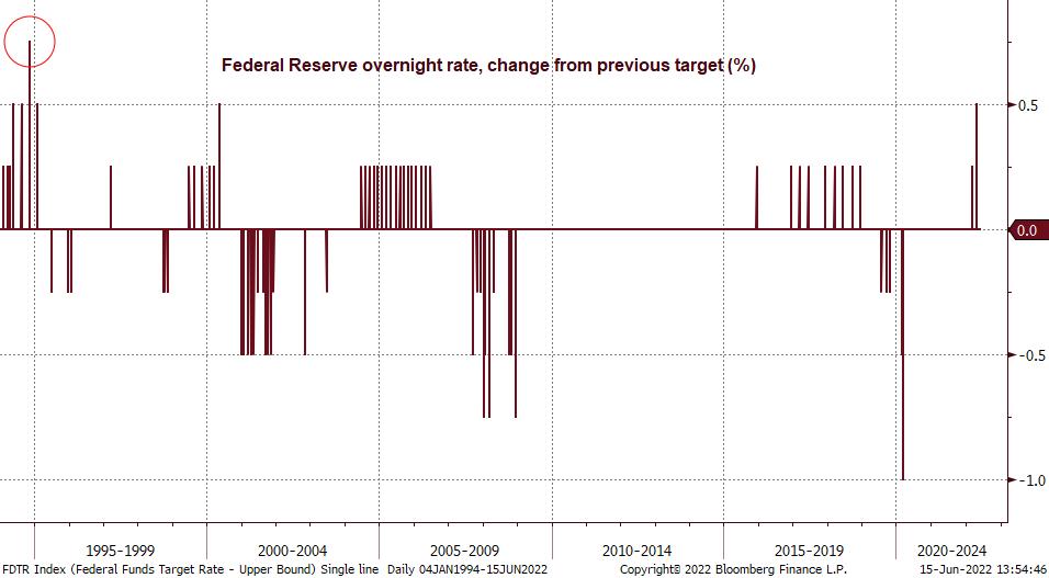 Well, today, the order was given, and the Fed hiked its overnight interest rate target three-quarters of a percent to 1.75%. In nominal terms, this isn’t a big deal. At this level we are still 0.75% below the peak in the previous cycle back in 2019. And both the bond market and stock market have already priced in this move. It is the change that is going to grab headlines, since the last time we saw the Fed raise rates this much in one year was back in 1994.