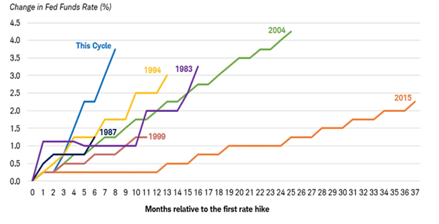 2022 saw one of the worst years on record for fixed income portfolios. The traditional Institutional portfolio mix of 60% equities and 40% bonds fell more than any year since 1937. Entering 2022, short term rates were still at a “pandemic-era” low as central bankers held real rates below -50 basis points to avoid a covid induced recession. As inflation began to move into the forefront of our economy due to supply chain constraints and increases in energy prices the federal reserve shifted their focus from stimulating the economy to fighting inflation through what has now come to be the fastest interest rate hike cycle on record.