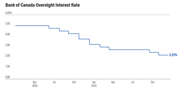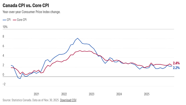 After years of headlines dominated by price spikes, 2025 was the year inflation finally cooled. In Canada, inflation fell into the mid-2% range as supply chains normalized and energy prices eased. Inflation didn’t disappear entirely and the damage that was done since 2022 will not be reversed. Still, compared to the turbulence of 2022 and 2023, 2025 was a year of progress in restoring price stability.