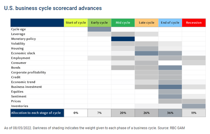 U.S. business cycle score shifts to ‘end of cycle’ as we find that the business cycle has left behind ‘mid cycle,’ skipped right over ‘late cycle,’ and is now firmly in ‘end of cycle’ – a position that normally only lasts for a quarter or two before recession strikes.