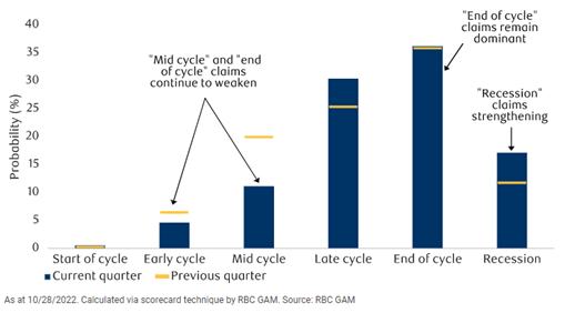 Our refreshed U.S. business cycle scorecard makes the same claim as a quarter ago: that the economy is at the “end of cycle”. Furthermore, the cycle continues to march forward in subtle ways. Counterclaims for “early cycle” and “mid cycle” have palpably weakened relative since last quarter, while “recession” counterclaims have strengthened (see chart).