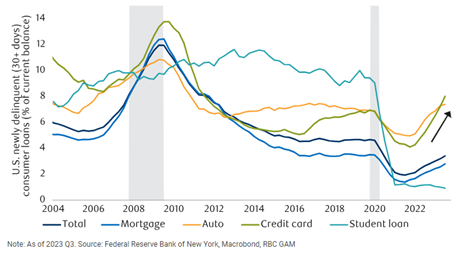 Rising interest rates however are beginning to hurt with overall U.S. consumer loan delinquency rate rising, most sharply in Auto and Credit card repayments. Auto loan delinquencies are now at their highest point in over a decade, though mortgage rate delinquency is still low by pre-pandemic standards