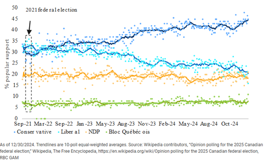 Parliament has been postponed until March 24, eliminating the possibility of a winter election. A spring election is most likely, though a Liberal-NDP deal could push it to the fall. Current polls show the opposition Conservative Party maintaining a strong lead, with the Liberals potentially falling behind the NDP. A majority Conservative government seems likely unless voter sentiment shifts dramatically.